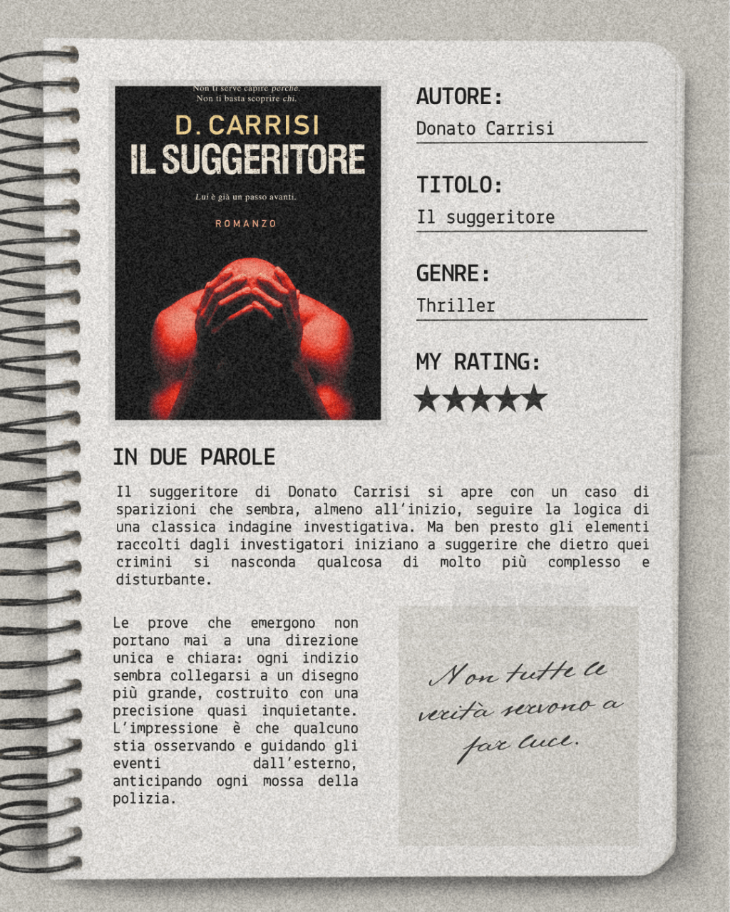 Leggere Il suggeritore di Donato Carrisi è un’esperienza che va oltre il classico thriller. Non è solo una storia da seguire, ma un meccanismo che lentamente ti trascina dentro una sensazione costante di inquietudine, come se qualcosa, sotto la superficie, stesse sempre osservando.