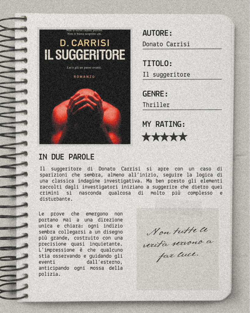 Il suggeritore è un thriller che non si limita a intrattenere, ma che lavora sulla percezione del lettore. Non è solo una storia di indagine, ma un viaggio dentro la manipolazione, la paura e la fragilità della mente umana.